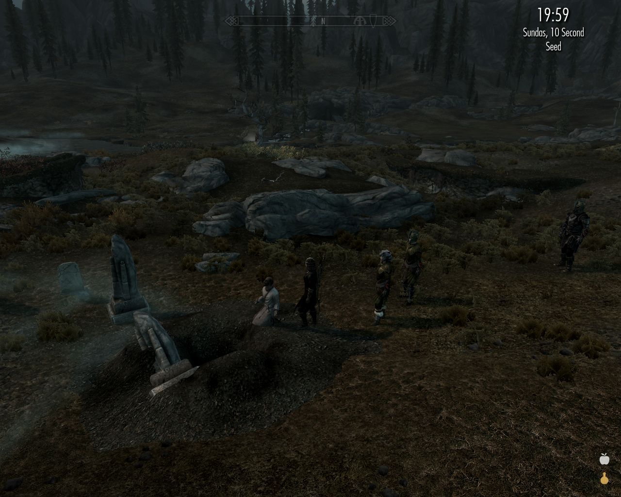 I tell Valandro who is praying at Forad's grave that this is all we can do for him. He says, no problem, he'll check the cave out with Andurs of Hviterun and see if they can find some traces of the magic used on those three animals. We've been of big help, he says.