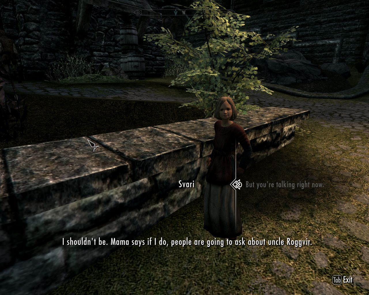 Svari lives in a house not far from mine but much smaller. I tell her how I talked to a dragon up on a high snowy mountain. Svari is utterly fascinated, and tells me in turn how her mother is grieving her brother Roggvir. As we stroll along the street, Svari says Uncle Roggvir just disappeared one day and she was told that she can never see him again, so she presumes he's dead.