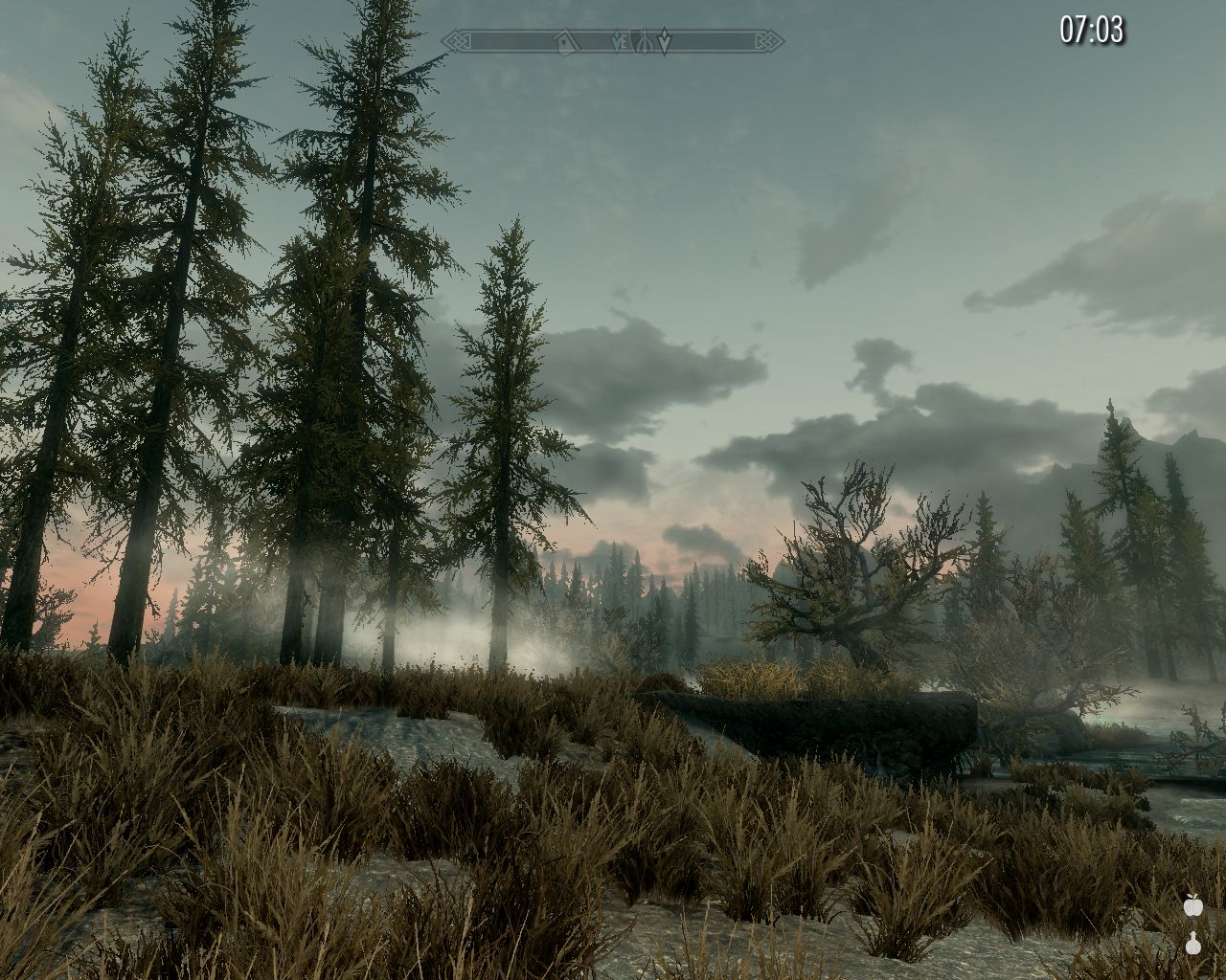 We take a boat to the eastern shore. During our journey across the marshland, we kill a chaurus. This somewhat forbidding landscape looks particularly wonderful on this cold morning: