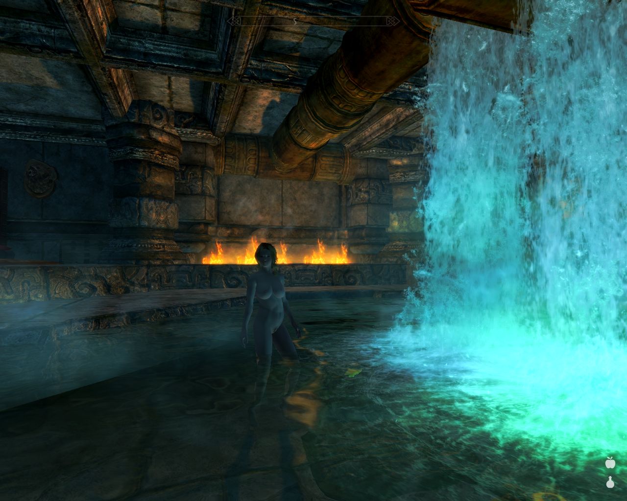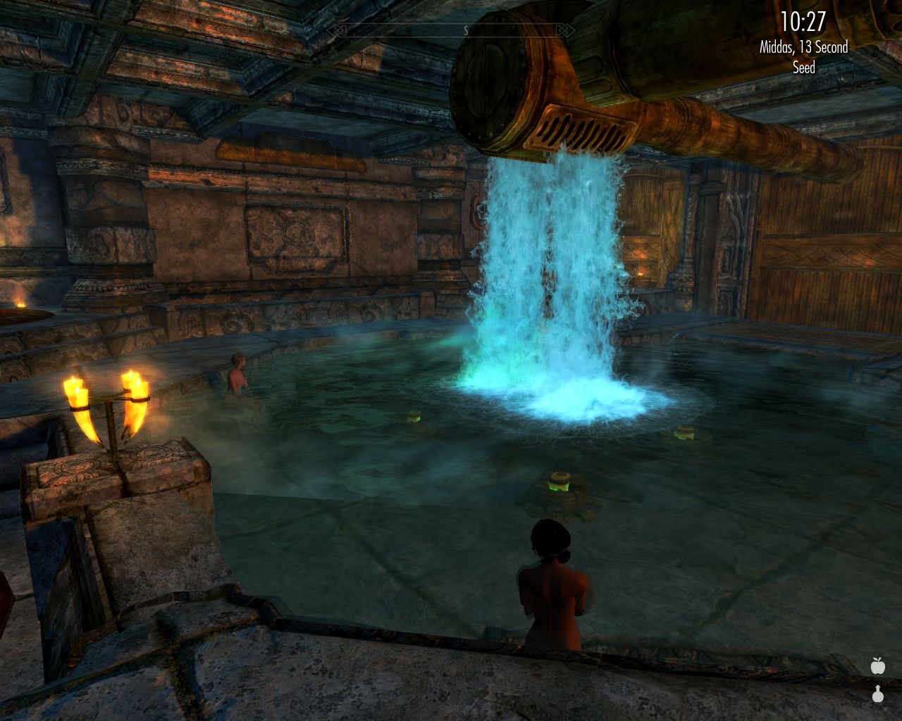 Four naked girls are sitting in it at the moment. (The rest are in the main hall fully dressed.) This is so fantastic I'm having real difficulties resisting the urge to throw my clothes off and jump in with them. But I must hold myself back, with the proprietor, a very serious-looking old man, standing right beside me. Not entirely without sarcasm, he says he assures me nobody is hiding any skooma here.