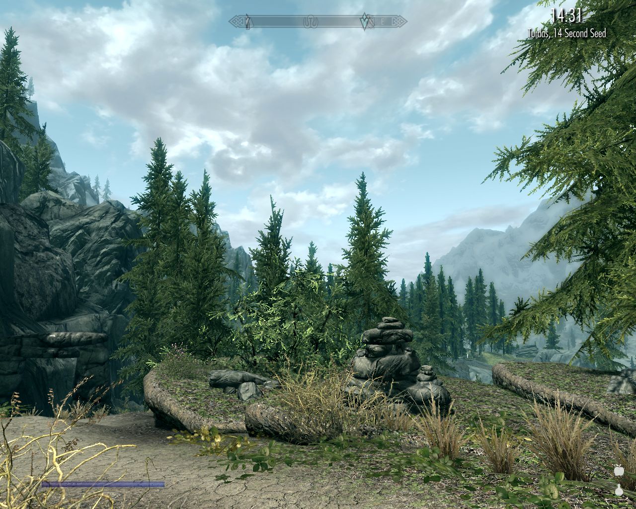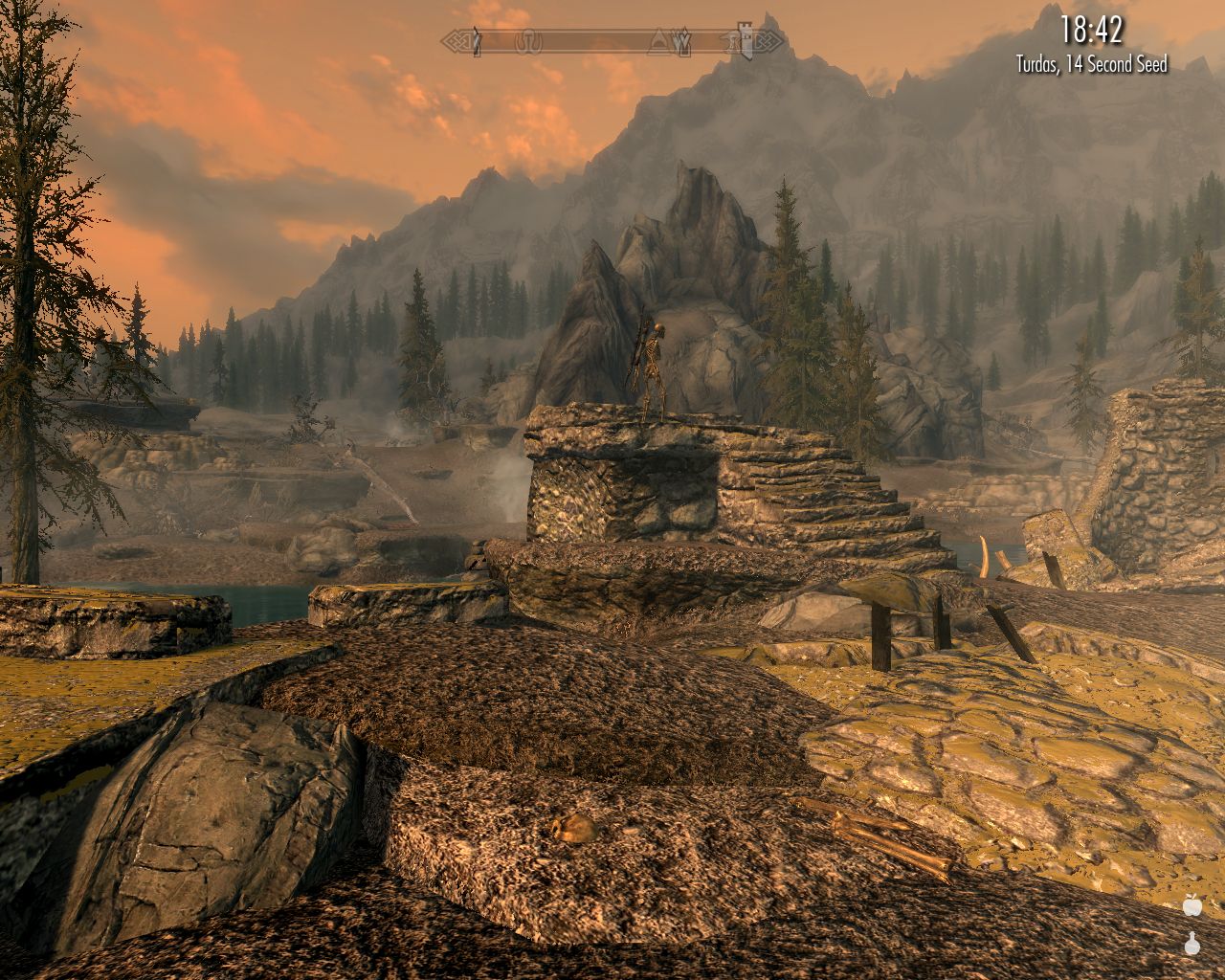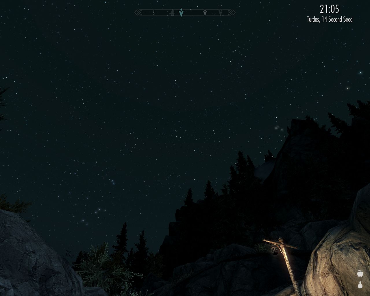 All we learn from the books is that there should be Falmers living in Alftand, which we already knew. I'm staying with my decision to not pursue this Falmer quest any further. I'll just return the books to Urag. But that can wait. We're on our way to the south right now, so we head for Vernim Wood where we catch a market trader still at work and hear some local news. Then we run to Shor under the most spectacular starry sky.
