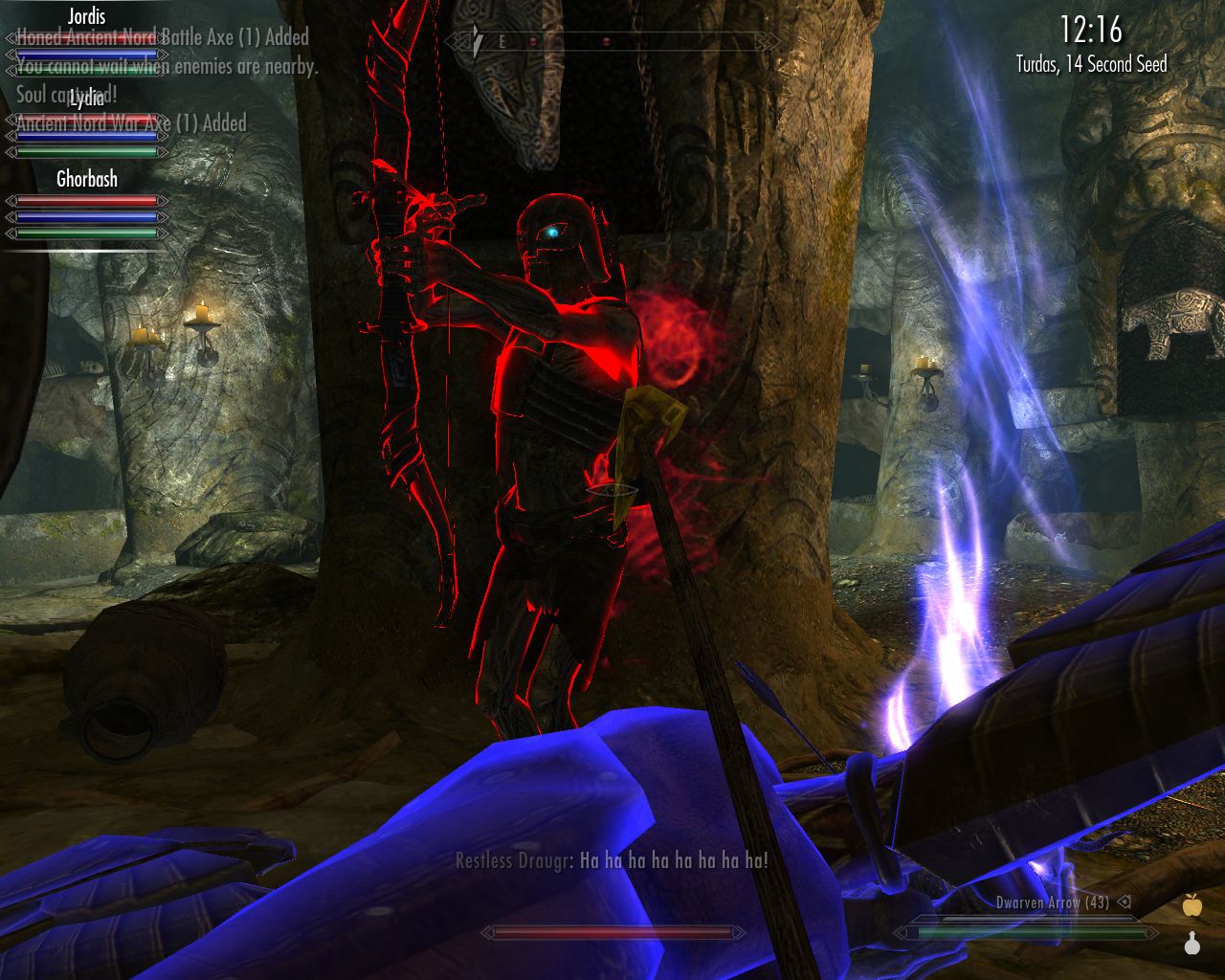 This is your usual draugr dungeon, not a very big one, but the draugrs are the fiercest we've ever seen. I get hurled across rooms and even knocked unconscious twice, and that is in spite of wearing high-grade Resist Shock gear. It's sheer horror.