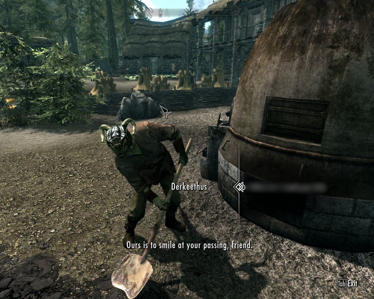 I ask the locals if they have some kind of an agreement with the dragon. They say they don't and in fact they're wondering why he attacks only very rarely. Maybe he watches the Windhelm–Riften highway and therefore can't be bothered with this village where people are used to taking cover quickly.