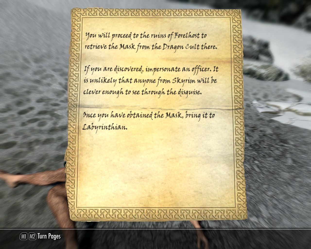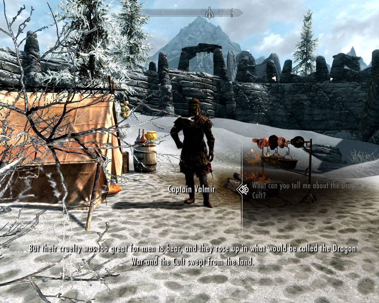 reach a courtyard. There's a tent and a man who introduces himself as Captain Valmir of the Imperial Army. He says he requires our assistance on a mission. He has been sent to retrieve a powerful weapon from this fortress Forelhost which used to be a stronghold of the dragon cult a long time ago, 1st era or so.
