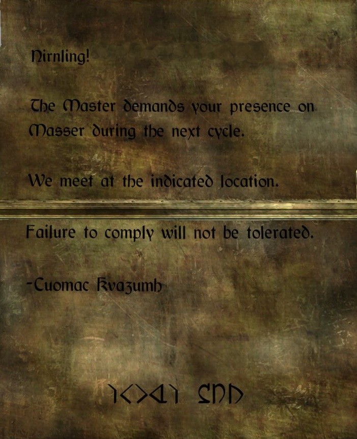 Does that mean that that Cuomac Kvazumh person is not from our planet? Whatever. What does he mean by "Masser"? Fort Masser? Or does it refer to a time? A day where the bigger moon Masser is full?? My followers are as clueless as I am. Too bad Jenassa isn't here. I stare at the words "indicated location", wondering where it could be. When you give someone a categorical order, it's probably important to you, so you should make sure the order is clear. But nothing in the text seems to contain a clue as to the place where I'm ordered to go.