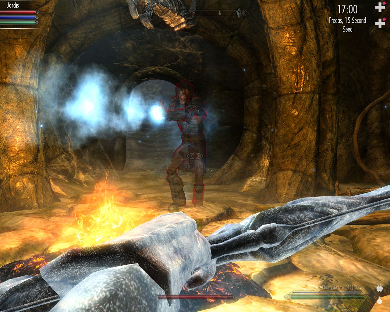 The overwhelmingly screamingest deceit indicator is, of course, "Trust me," but "I can explain," would, I think, get the second place. I invite Valmir to go ahead and explain all the same, and he tells us quite fluently a story that is obvious bullshit. In the meantime, the Stormcloak has realized Valmir has been sending adventurers after adventurers into that dungeon. He gets so furious that he stabs Valmir to death before I can stop him. I scold him, but there's no way to undo what he did, as I can use the Ritual Stone power only once in 24 hours. So Valmis can no longer be interrogated. We have to settle for searching him.