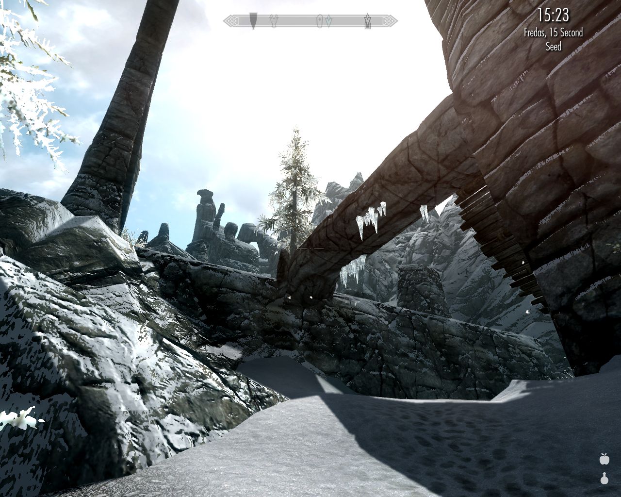 We climb higher and reach snowy mountainslopes. We descend again and find the ruins of a burned-down house. That citadel is quite near now. A snowfall begins when we reach it, and then ends almost before it has started. The place is called Stendarr's Beacon and it's occupied by a few virrs.
