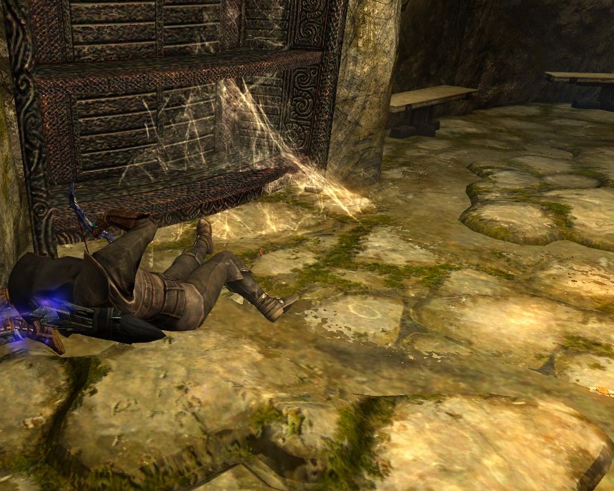 After lots of ghosts and draugrs and water and great halls, we reach a door that has three disks which have to be in the correct positions for the door to open. Each disk has 3 positions, so there are 27 variations. I get it right on the 11th try. And then we are attacked by a very horrible mage. He brings me close to death while I shoot half a dozen arrows into him that cause no damage whatsoever. I am sick with worry about the girls. After a long and frustrating fight, we manage to kill him after all and all my followers are alive. Even Ghorbash survived this onslaught! The girls tell me later he actually hid behind them all the time. Now that I stop to think about it, I realize I have noticed earlier (but been reluctant to acknowledge) that Ghorbash has been really clumsy with both a bow and a staff. Guess we're not going to have that group sex after all.