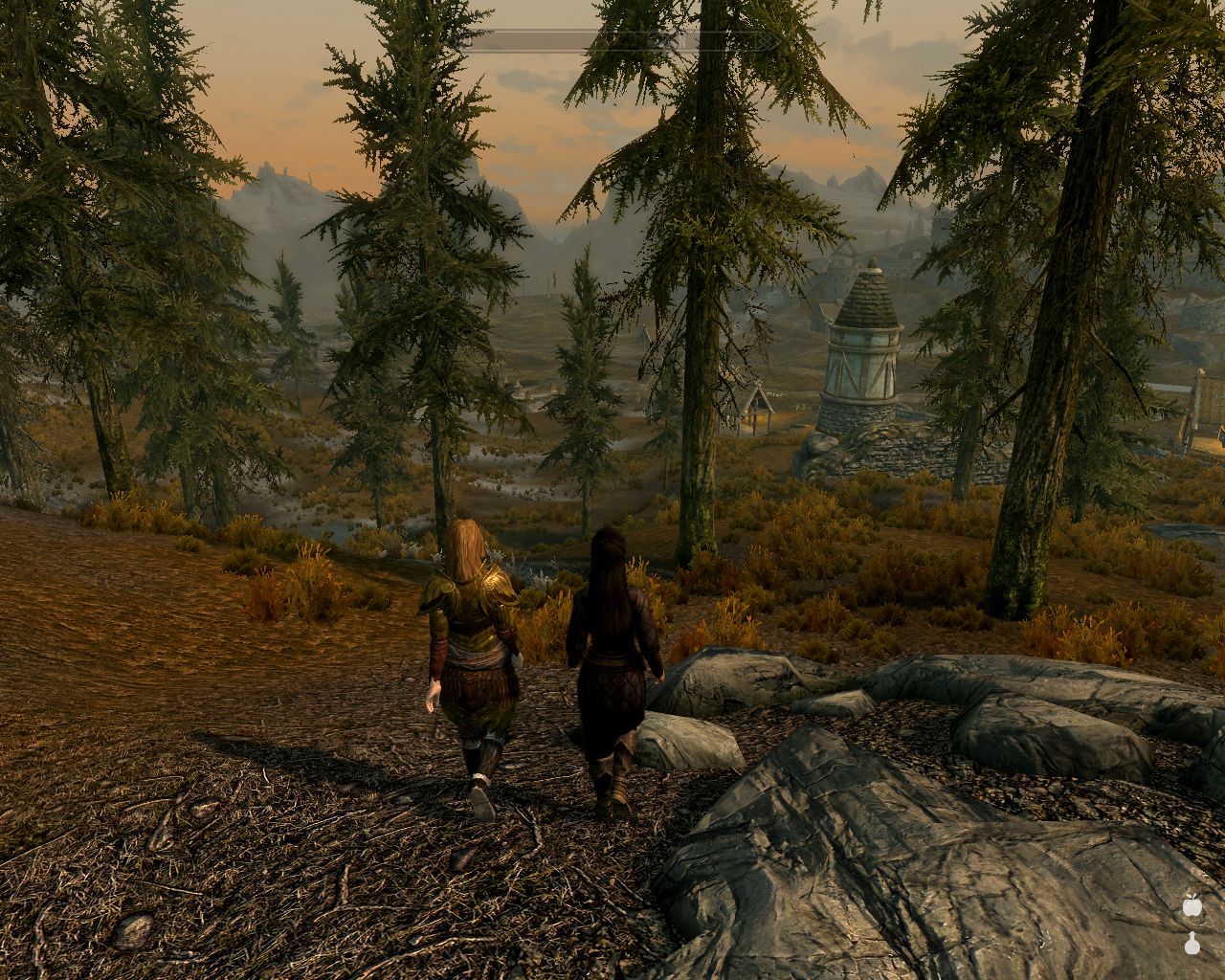 We're headed southeast to find North Skybound Watch, where there's supposed to be a pedestal onto which I'll have to place Faralda's book and cast a frost spell at it. To tell you the truth, I'm not at all sure we can even ascend the mountains from this direction. Until now, we have only traveled along the path that passes the Fox Club, leads southwestwards and ends up on the road to Helgen. Hadvar said there's another path up the hills. I hope we can find it.